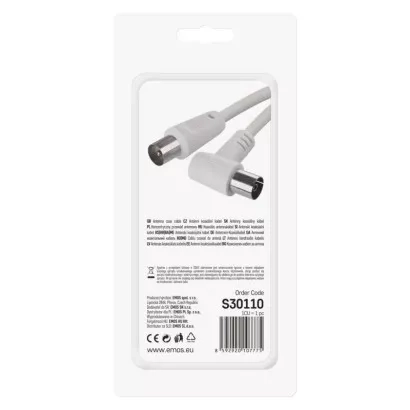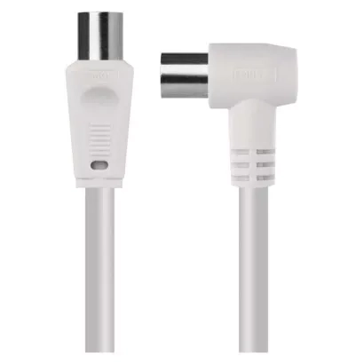 Anténní koaxiální kabel s vidlicí a zásuvkou IEC. Kabel má úhlový konektor (90°). Kabel má dvojité stínění pro redukci elektromagnetického rušení. Délka kabelu je 1,25 m. Koaxiální kabel je vhodný pro SAT, DVB-T, ANT, DECODER, FLAT TV a TV.