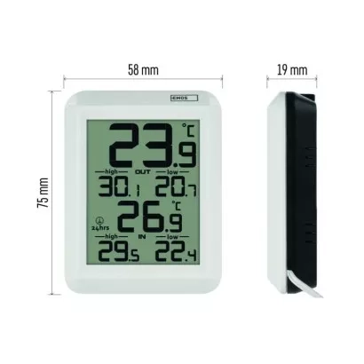 Digitální teploměr s drátovou sondou. Zaznamenává vnitřní a venkovní teplotu, min. a max. teplotu. Sonda má délku 0,9 m.