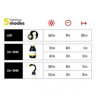 Svítilna je multifunkční díky třem způsobům použití - jako kempingová svítilna, stolní lampička a ruční svítilna.