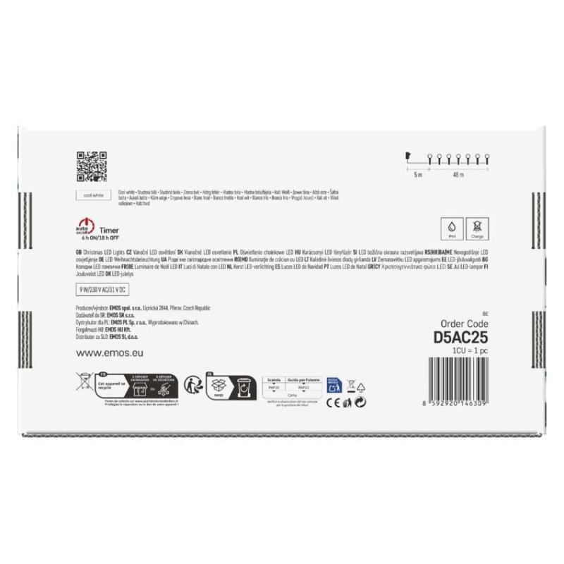 EMOS LED vánoční cherry řetěz – kuličky, 48 m, venkovní i vnitřní,studená bílá,programy,časovač