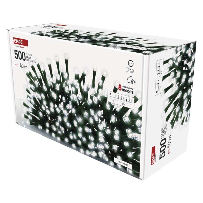 EMOS LED vánoční řetěz, 50 m, venkovní i vnitřní, studená bílá, programy, časovač