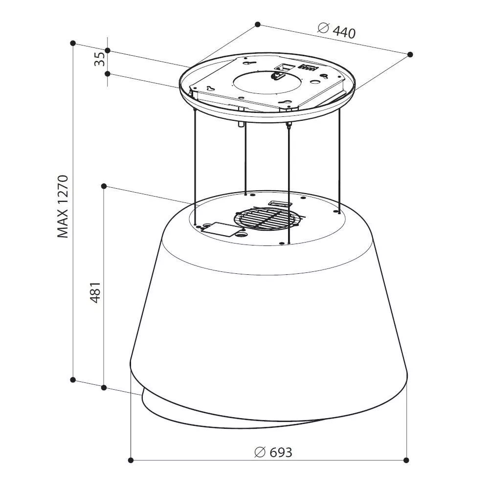Ucelený vzhled umocňuje spodní krycí panel z černého skla se štěrbinovým sáním. Koncentrovaný proud vzduchu o vyšší rychlosti získává vlastnost strhávat s sebou i páry mimo půdorys sací zóny.