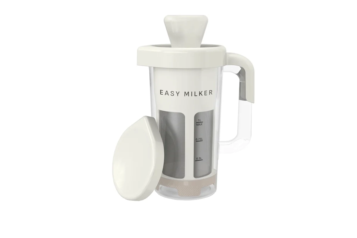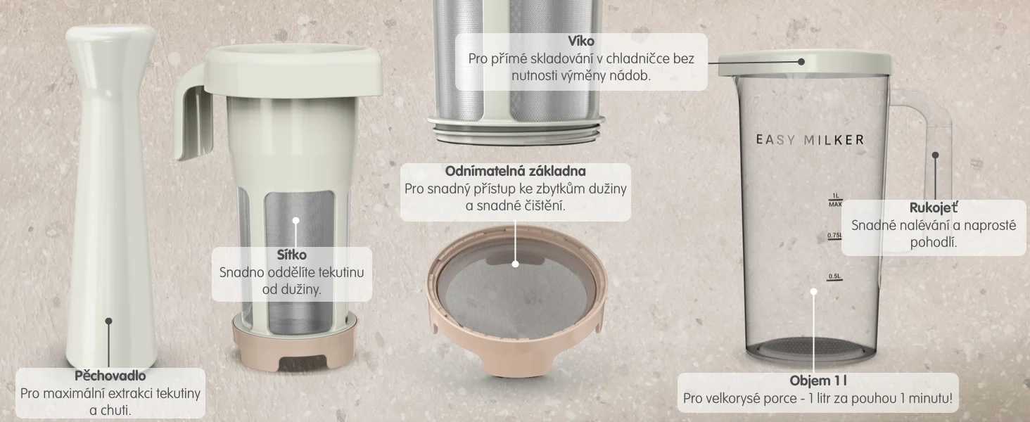 Obsah balení: Easy Milker se sítkem, 1l nádoba, 2 filtrační disky pro přizpůsobení textury, pěchovadlo a konzervační víko pro uchování surovin.