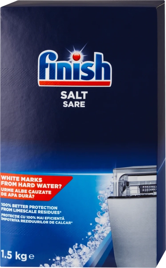 Finish sůl do myček nádobí s velkými granulemi změkčuje vodu v myčce, čímž pomáhá zvýšit čisticí efekt mycího prostředku a zároveň předcházet nebezpečnému usazování vodního kamene na nádobí a v myčce.