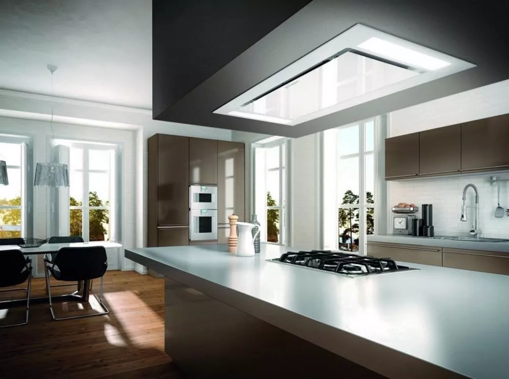 Plné zapuštění digestoře do stropního podhledu zajišťuje maximální volný prostor nad pracovní plochou a kuchyň se díky tomu stává vzdušnější.